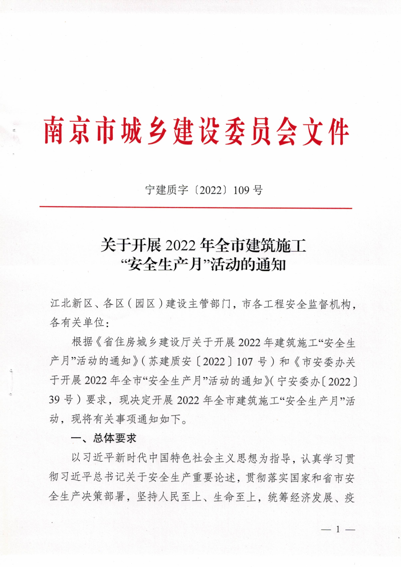 转发市建委《关于开展2022年全市建筑施工“安全生产月”活动的通知》(宁建质字〔2022〕109号)