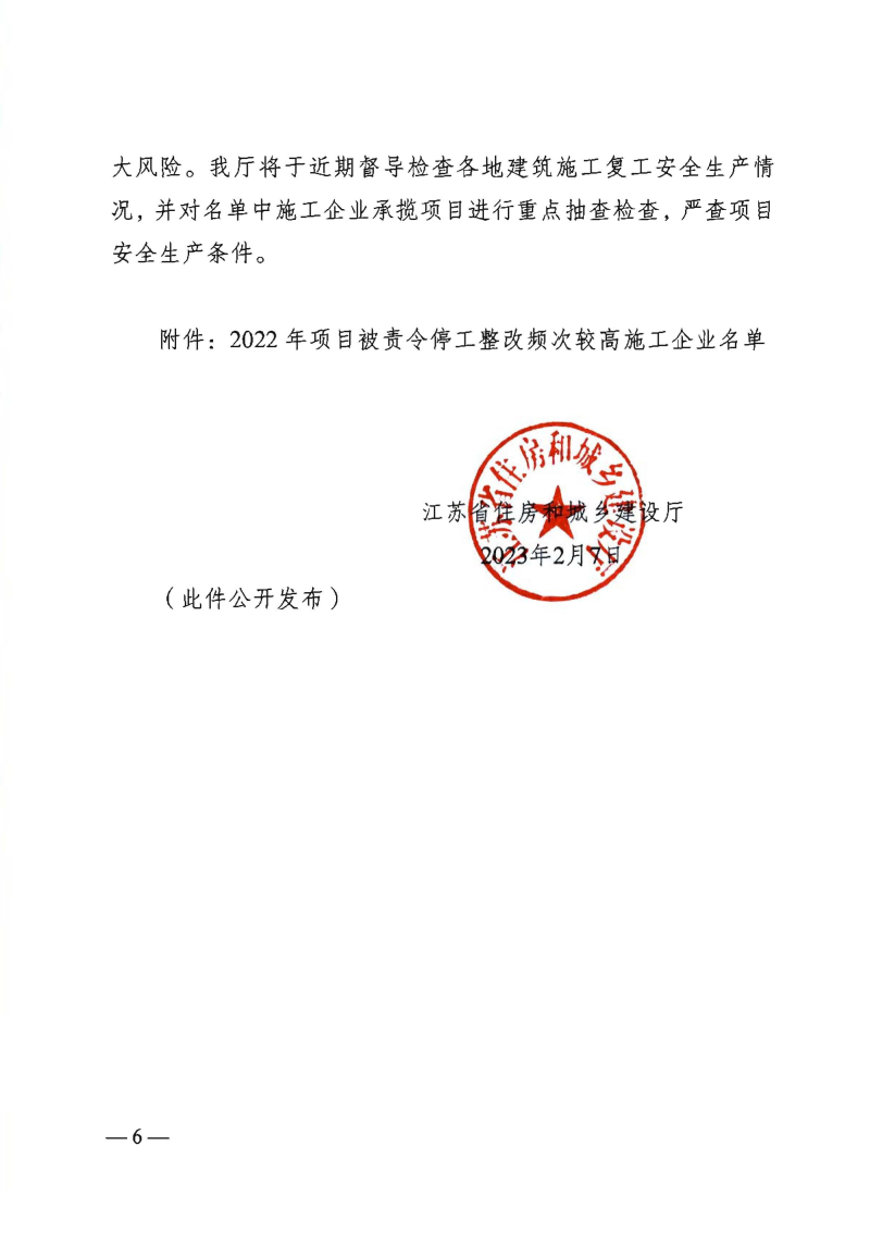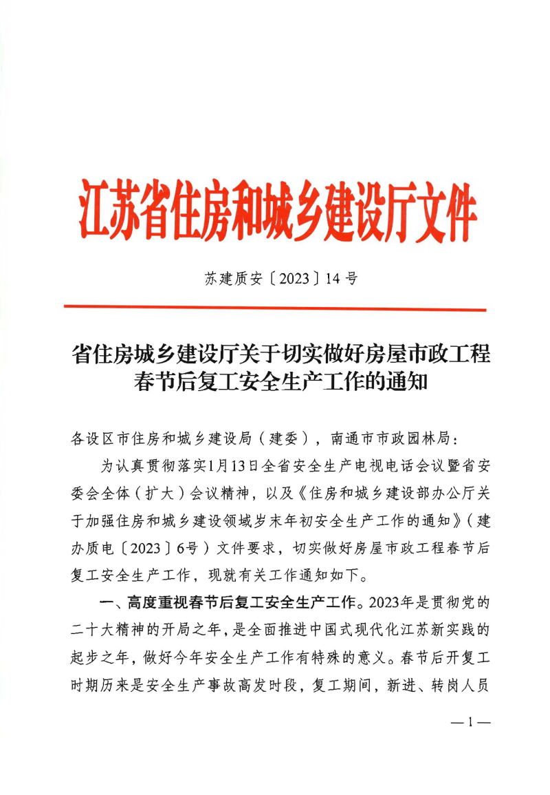 转发《省住房城乡建设厅关于切实做好房屋市政工程春节后复工安全生产工作的通知》(苏建质安〔2023〕14号)