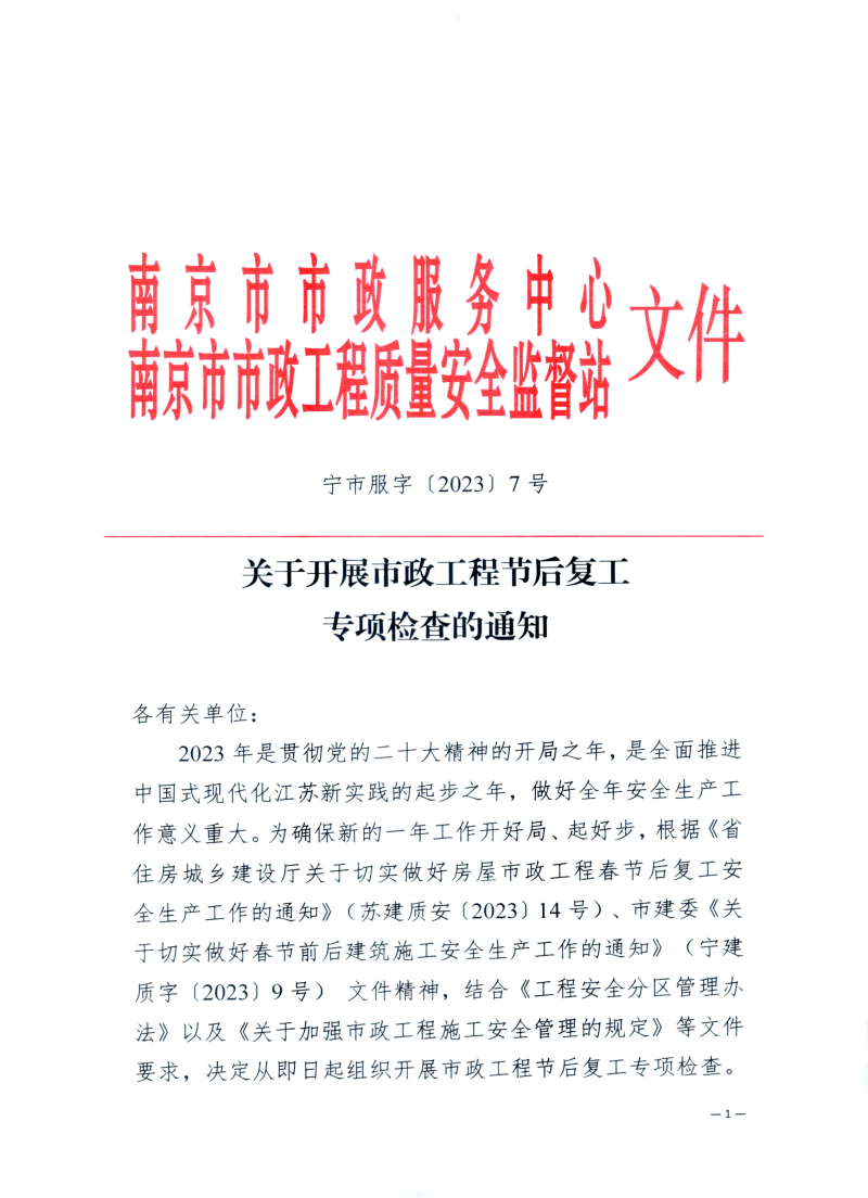 关于开展市政工程节后复工专项检查的通知(宁市服字〔2023〕7号)