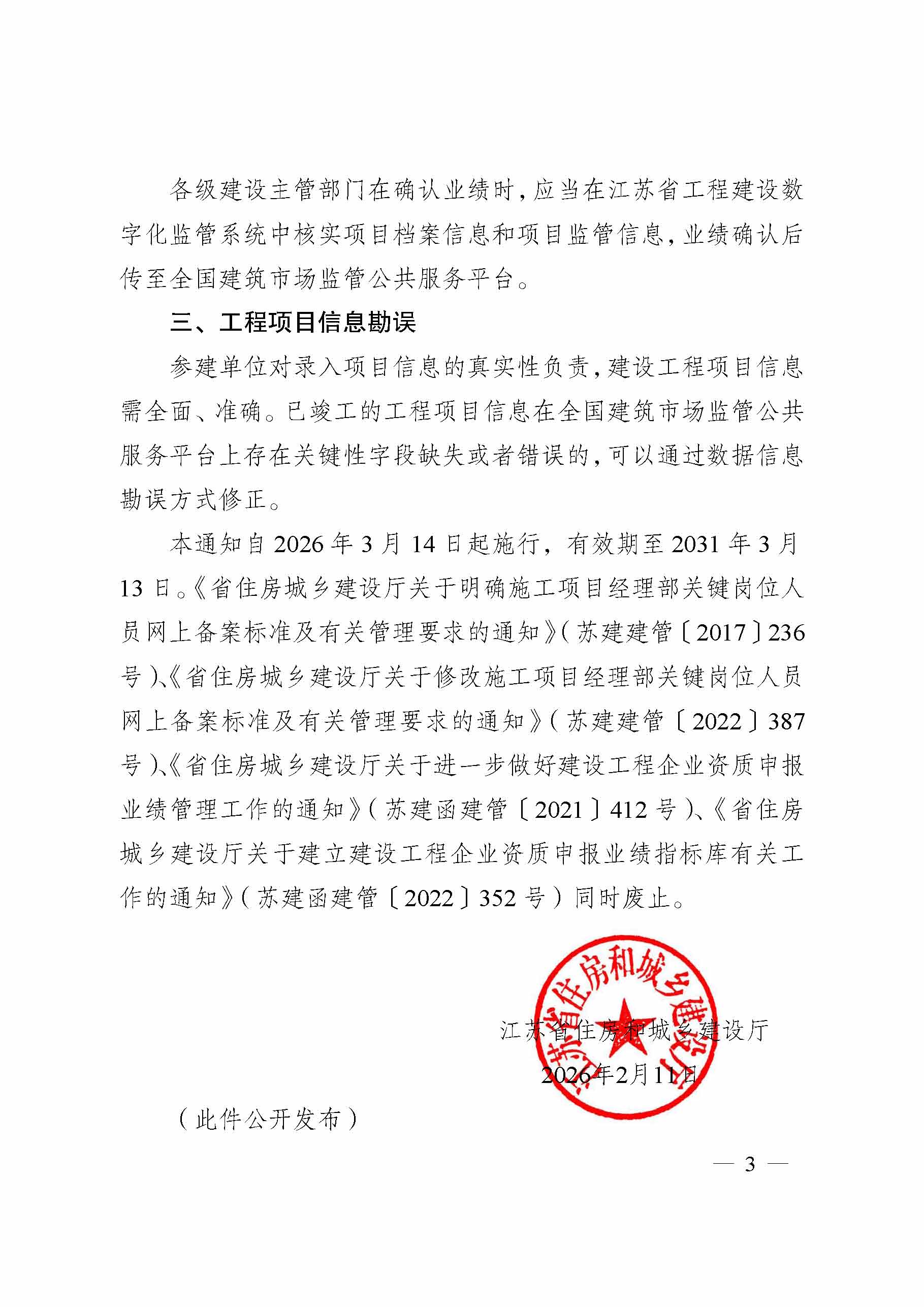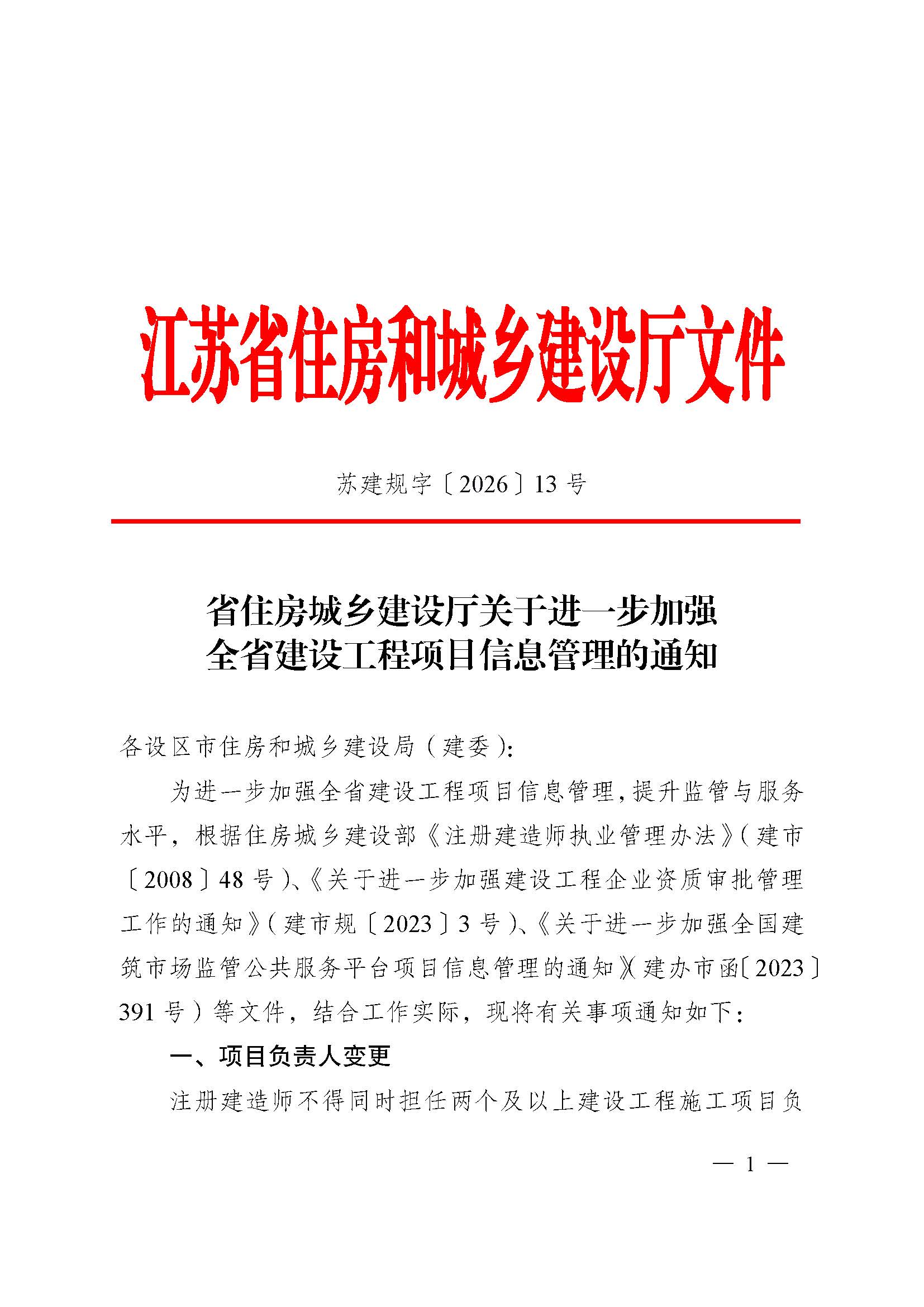 转发省住建厅《省住房城乡建设厅关于进一步加强全省建设工程项目信息管理的通知》(苏建规字〔2026〕13号)